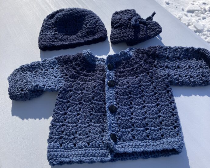 Blue Crochet Baby Cardigan Hat Booties Set Crocheted baby set in shaded denim blue. Includes a cardigan with dark buttons, a matching hat, and booties with ties. 3-6 months size. Shoulder to shoulder 10”.Continue Reading
