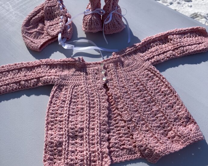 Pink Crocheted Baby Sweater Booties Hat Set 3-6 months Handmade pink crocheted baby set. Has a sweater with buttons, booties with white ribbons, and a matching hat with white ribbons. Shoulder to shoulder 8”. 3-6 months. 60% Bamboo/40% cotton.Continue Reading